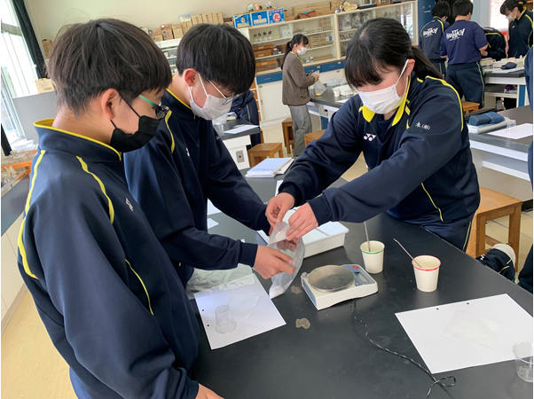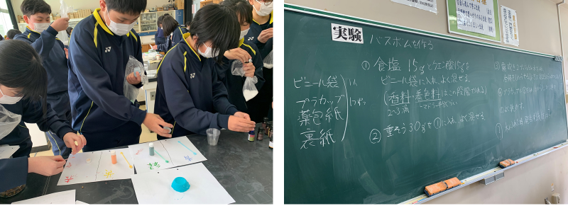 2年生の理科の授業では、「気体の発生」の発展学習として、バスボム作りに挑戦です。色や香料を工夫しながら、オリジナルのバスボムを制作しました。