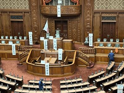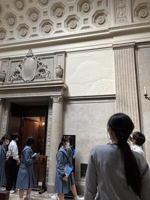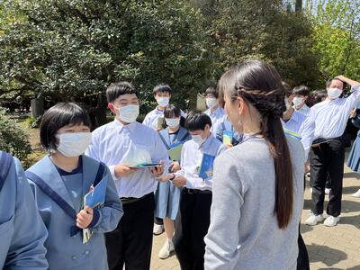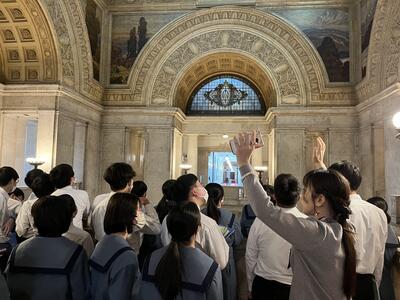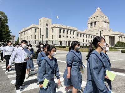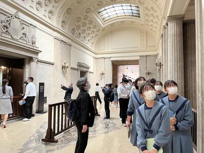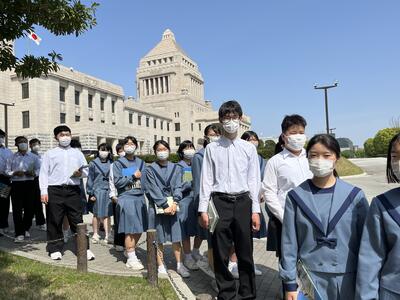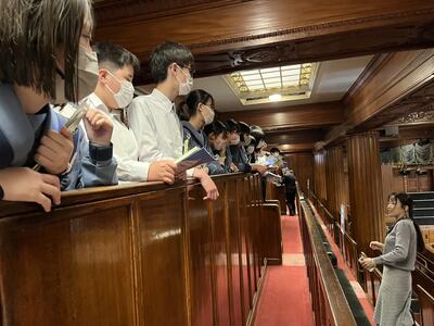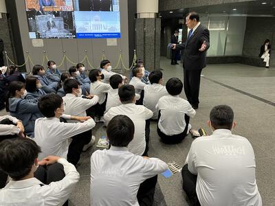 亀岡議員が出迎えてくださいました。その後、内部の見学をしました。公民で学習した知識が役立たました。