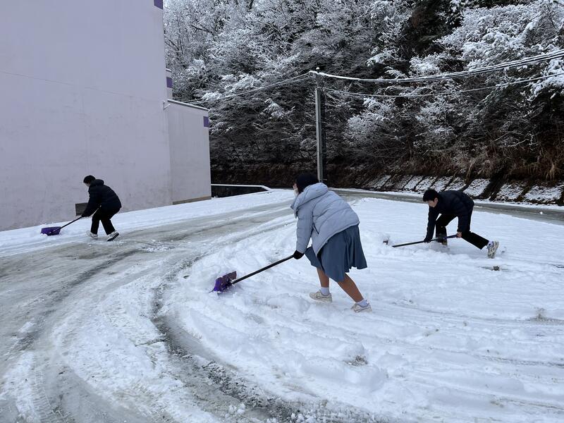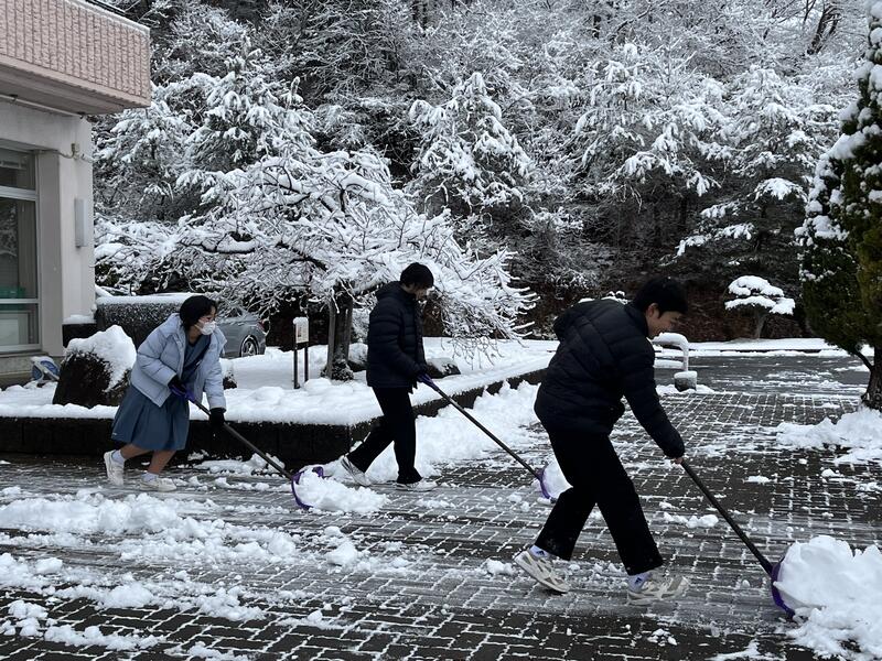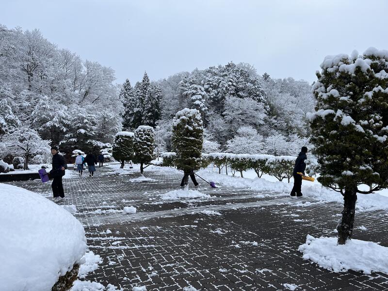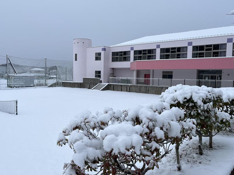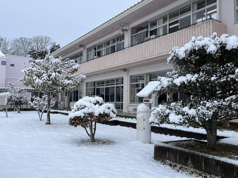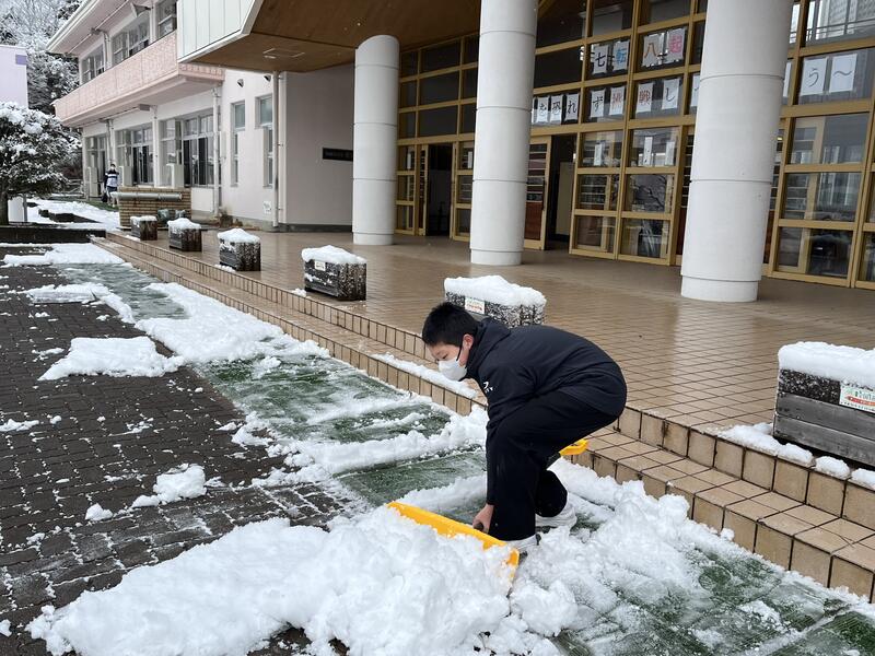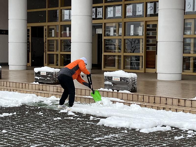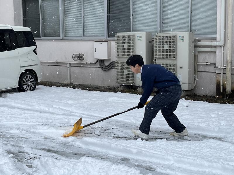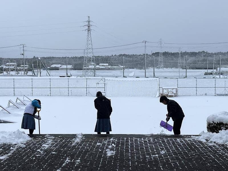 雪かき 2024年2月6日 13時36分 一面の雪。校舎も校庭も一夜のうちに雪に覆われてしまいました。朝早く登校した生徒達が雪かきをしています。お陰様で玄関も駐車場もきれいになりました。どうもありがとう。