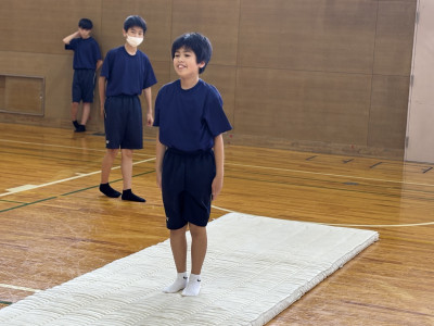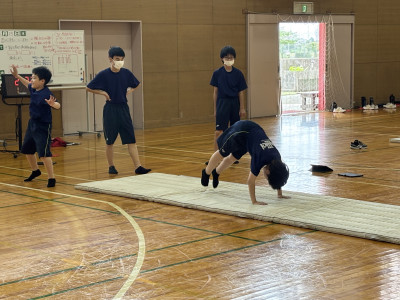 マット運動では技を練習した直後に、技のよかった点、改善点など気がついたことをアドバイスをしながら、取り組んでいました。