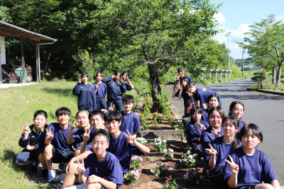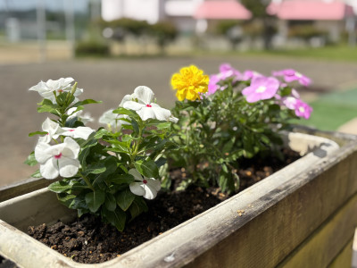 学校敷地内の花壇に花の苗を全校生で植えました。