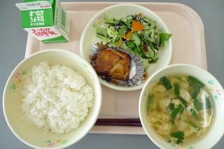 今日の給食は、ごはん、ニラ玉スープ、タンドリーチキン、ひじきサラダ、牛乳です。