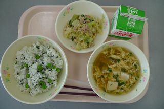 今日の給食は、わかめピースごはん、舞茸かき玉汁、チンゲンサイのアーモンド炒め、牛乳です。