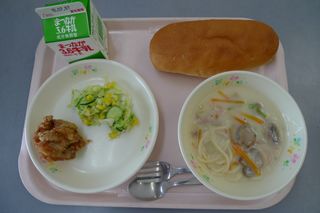 今日の給食は、コッペパン、スープスパゲティ、コールスローサラダ、フライドチキン、牛乳です。