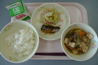 今日の給食は、ごはん、肉じゃが、イワシの梅煮、辛子あえ、牛乳です。