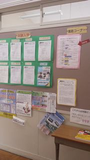 3年生の廊下の様子です。各行事の写真や先日の全校絵を描く会の作品など掲示されています。また、進路コーナーもあり、夏の体験入学の案内や、各種情報、そして入試問題などがいつでも見られるようになっています。