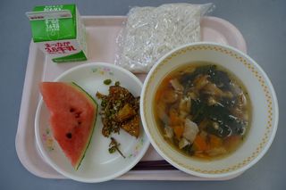 本日の給食は、きつねうどん、サツマイモと煮干しの揚げ煮、スイカ、牛乳です。