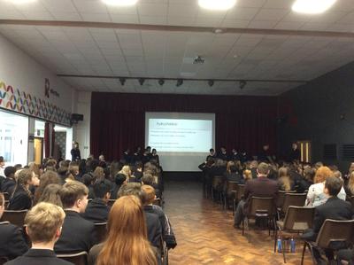 現地時間11月21日(水)10:10、ロセットスクールの講堂において、ハロゲート市長様ご臨席のもと、ロセット校8年生との交流式典が開かれました。訪英団の生徒達は南相馬市や石神中学校を紹介するプレゼンテーションと合唱を披露しました。緊張しながらも練習の成果を発揮することができ、大きな拍手をいただきました。