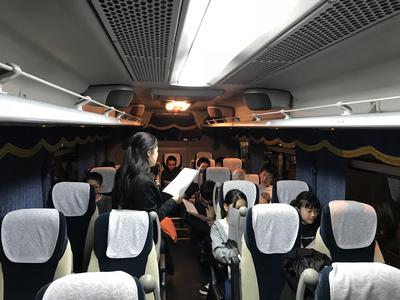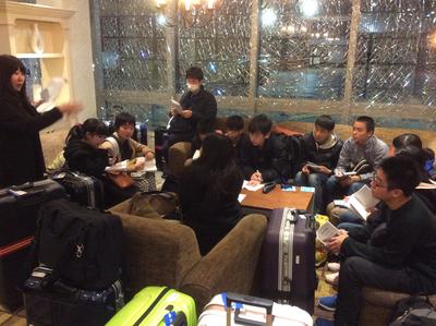 17:00東北道川口PAで休憩中の一コマです。21日の交流活動に備えて、石神中学校を英語で紹介するプレゼンテーションの練習をしています。