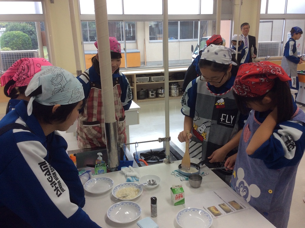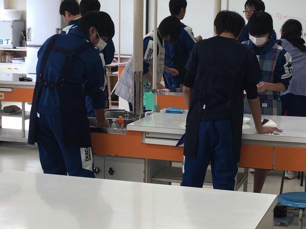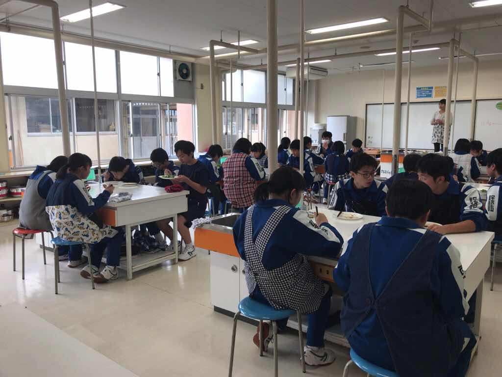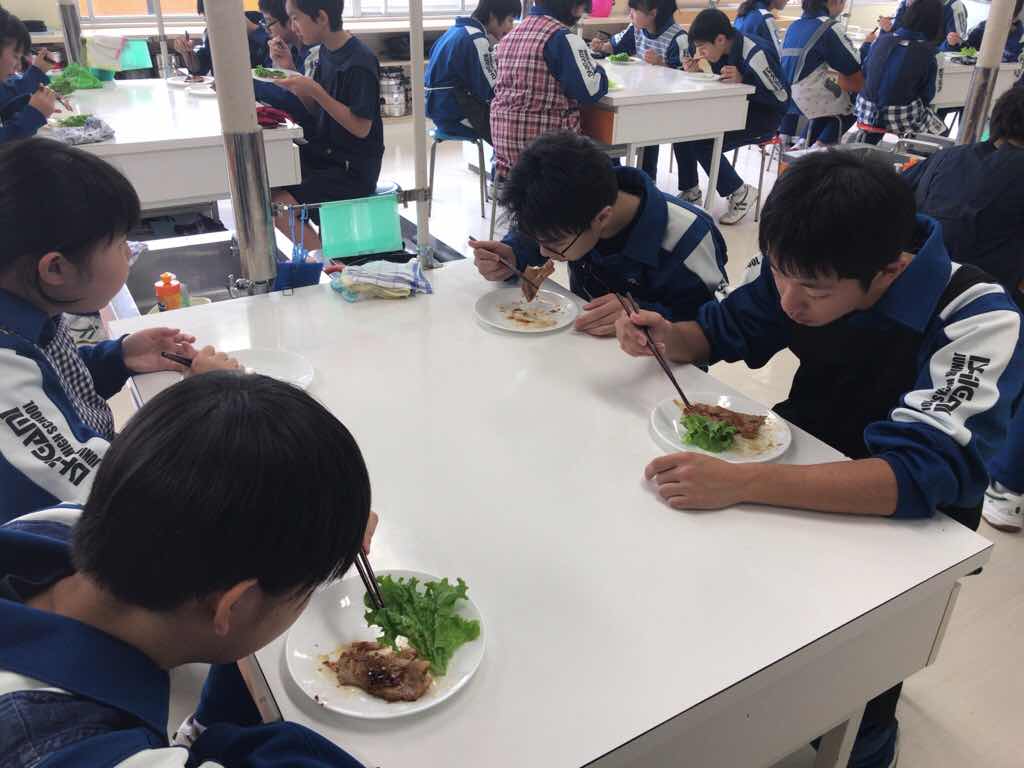 2-3の家庭科の授業では調理実習を行い,豚肉の生姜焼を作りました。試食の場面では「焼き加減やタレの作り方が難しかった」「時間があれば家でも作ってみたい」などと感想を話してくれました。後片付けも協力しながら手際よく進めることができました。