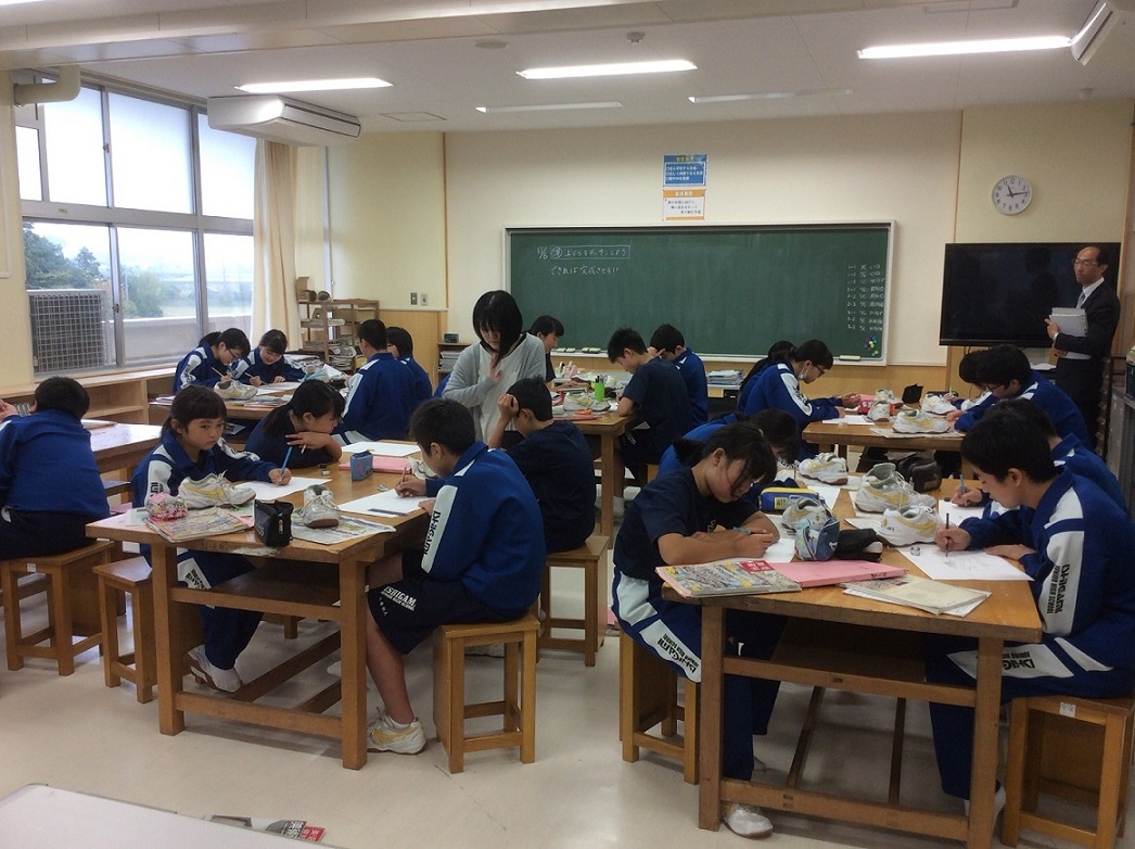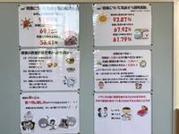 被服室前の掲示板に「朝食について見直そう週間運動」の結果が掲示されています。結果を見ると、朝食を食べた割合は0.88ポイント、朝食で汁物を摂った割合は3.33ポイント上昇しましたが、朝食で野菜を摂った割合は1.24ポイント下降しました。ここからわかることは、汁物なども含め一口でも食べて登校する生徒の割合が増えているということです。これは素晴らしいことです。今後の課題はバランスよく食べることです。健康な体を作るうえで、バランスのよい食事はとても大切です。