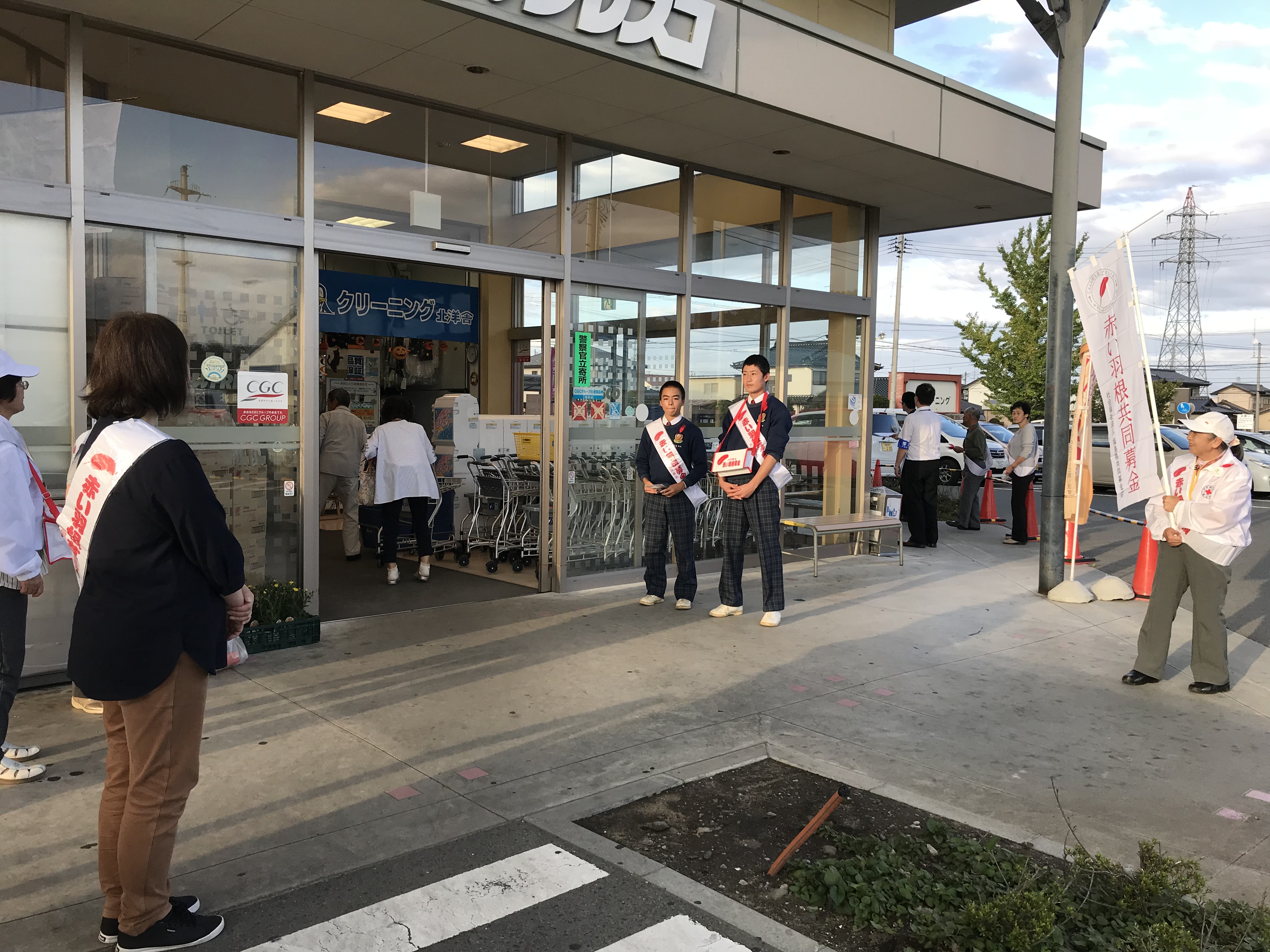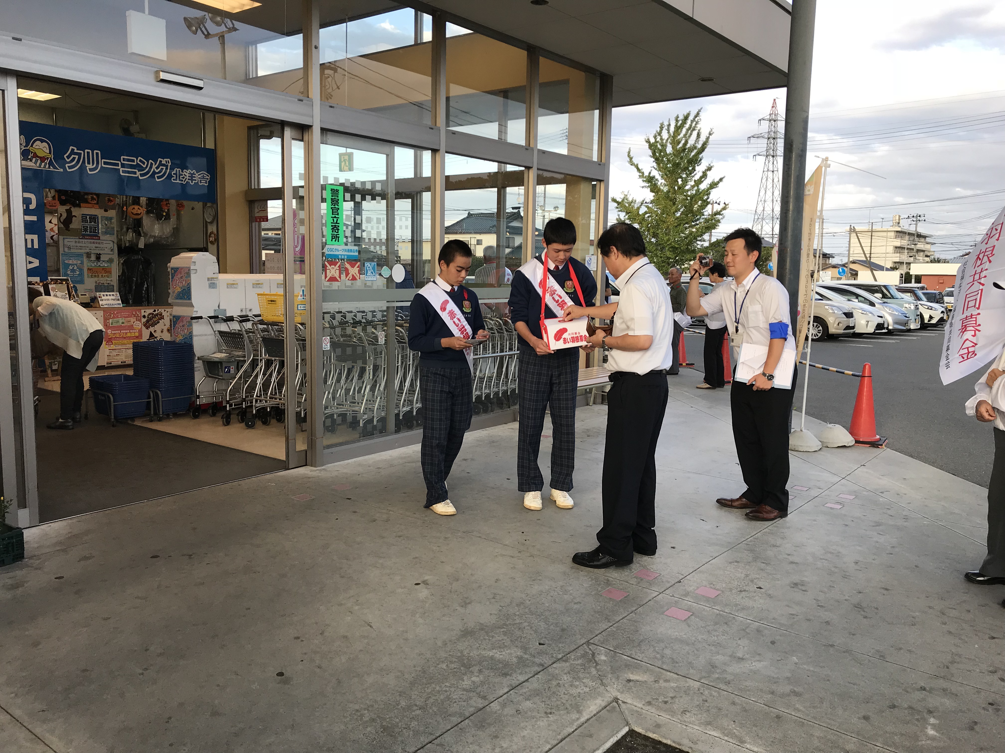 10月1日より全国一斉に「赤い羽根共同募金運動」が行われています。本日16:00より、本校生徒会を代表して森洋斗士君と荒金里紀君が南相馬市社会福祉協議会の皆様と共にフレスコキクチ北町店舗前で行われた街頭募金活動に参加しました。