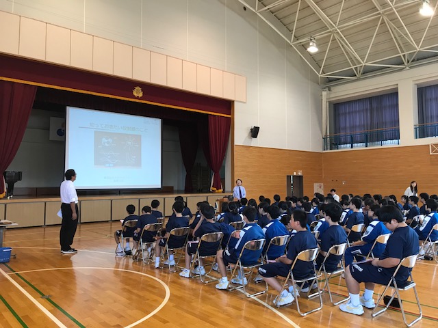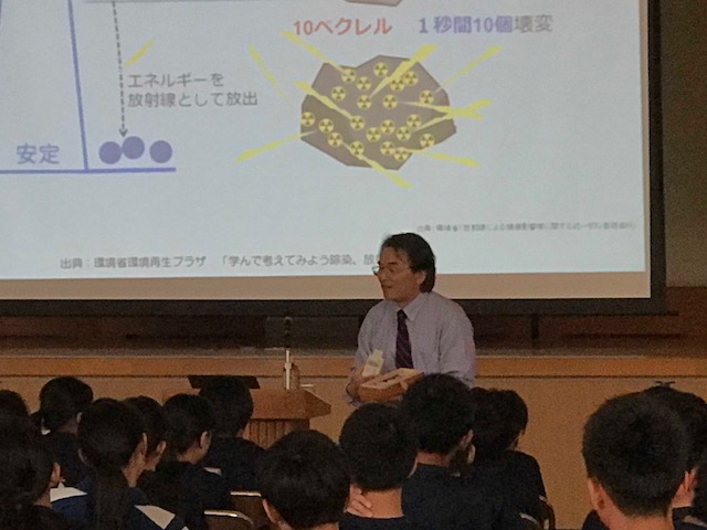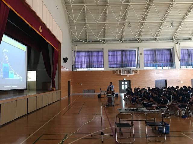 本日4校時に、本校体育館において、獨協医科大学RIセンターの高橋克彦先生にお越しいただき、1年生を対象に放射線教室を開催し、