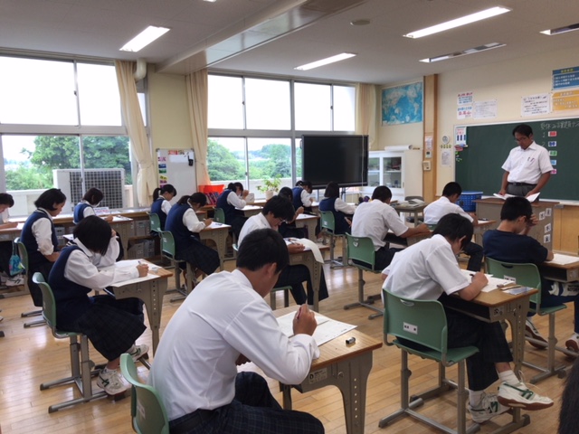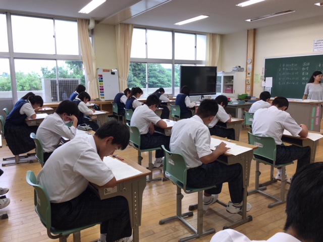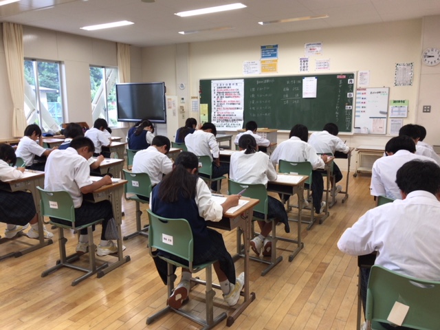 今日は、夏休み中の学習成果を確認することをねらいとして、1・2年生は課題テスト、3年生は実力テストに臨みました。全校生が、1校時から集中して取り組みました。