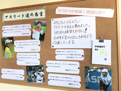 中体連まであと15日。保健室前の廊下の掲示板には、試合に臨む選手の皆さんの励みになるよう、アスリートの名言が掲示されています。一日一日を大切に、練習を頑張ってください。