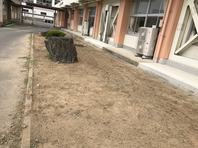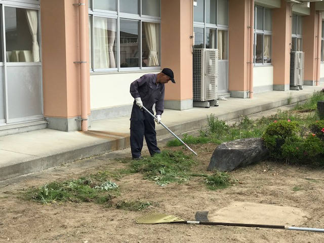 用務員の豊田さんが、校舎南側の花壇の除草作業中です。生徒達が授業に集中できるようにと、機械を使わず草削りで丁寧に作業をしてくれています。ありがとうございます。
