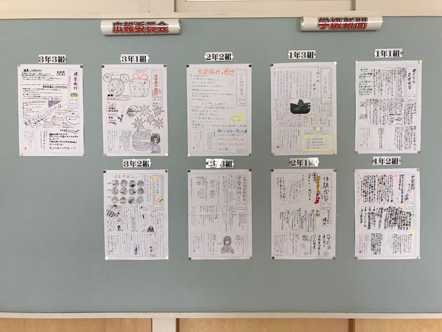 各学級の広報委員が学級新聞4・5月号を発行しました。この2ヶ月間の学校行事の記事を中心にして各学級で工夫を凝らした新聞をつくりました。1階1年学習室前廊下に掲示してあります。ぜひご覧下さい。