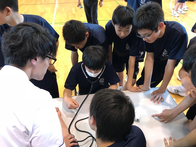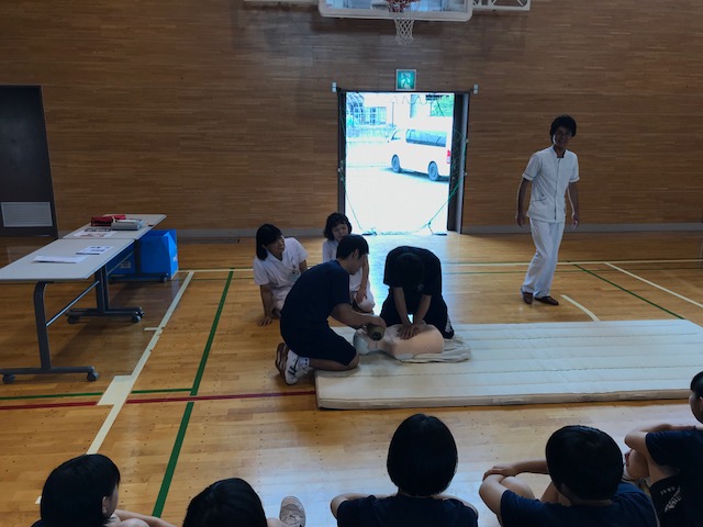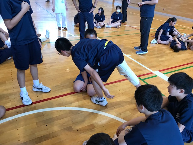 この行事は、「キャリア教育の一環として看護師の仕事の内容等を理解するとともに生徒の社会的・職業的自立に向けた基礎能力や態度を育てること」をねらいに行われるもので、生徒達は、講話や脳梗塞で右半身が麻痺した患者さんの体の動きの体験、血圧測定体験、心肺蘇生法の体験を通して看護師の仕事について理解を深めました。