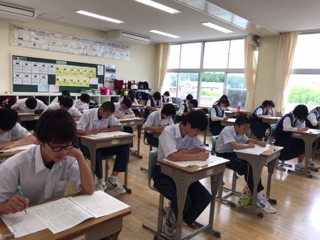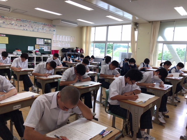 2018年6月1日 09時20分3学年では、第1回校内実力テストを実施しています。実力テストは、希望進路実現に向けて、これまでの学習の成果や現時点での課題を知り、今後の学習の計画を立てていくために大切なテストです。生徒達は皆、落ち着いた雰囲気の中で真剣な態度で臨んでいます。