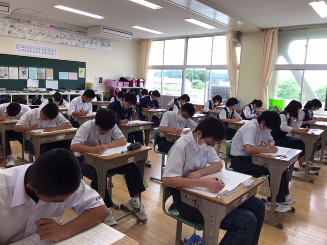 3学年では、第1回校内実力テストを実施しています。実力テストは、希望進路実現に向けて、これまでの学習の成果や現時点での課題を知り、今後の学習の計画を立てていくために大切なテストです。生徒達は皆、落ち着いた雰囲気の中で真剣な態度で臨んでいます。