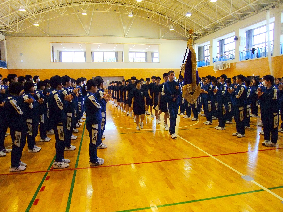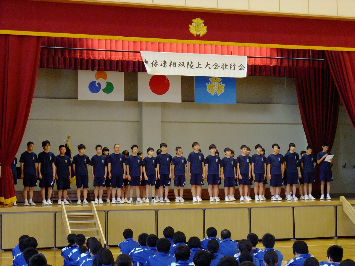昨日、第61回福島県中学校体育大会陸上競技大会相双地区予選会の選手壮行会を実施しました。大会は5月17日(木)、市内雲雀ヶ原陸上競技場で行われ、本校からは、1年生7名、2年生15名、3年生12名の計34名が参加します。ぜひ,練習の成果を発揮してきてほしいと思います。 頑張れ!石神中!