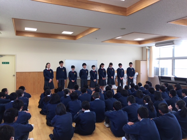 さらに、「変わるべき時に変われるようになってきた、オンとオフのメリハリがつくようになってきた」と、これまでの2年間での成長を振り返るとともに、3年生として、学校生活のスローガン「時を守り・場を清め・礼を正す」を高校入試との関わりから考え、次の3点を確認し合いました。