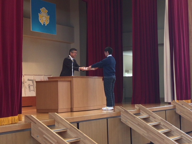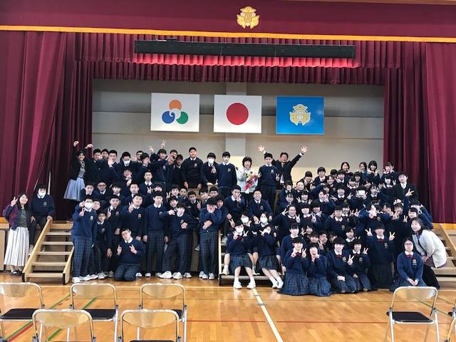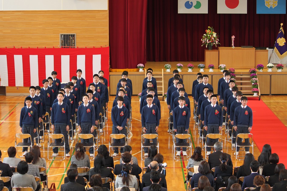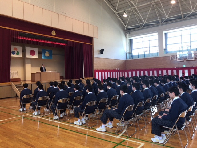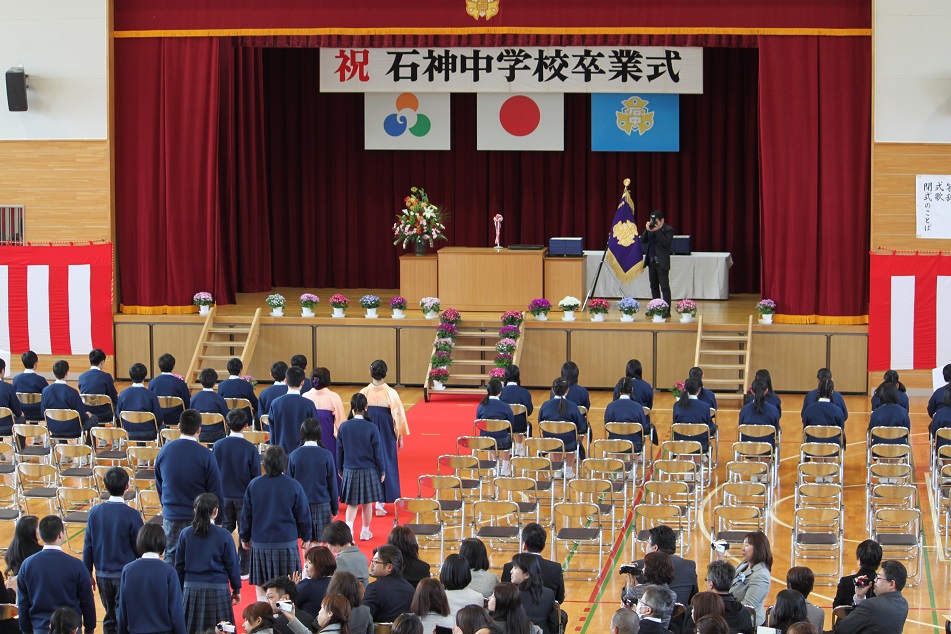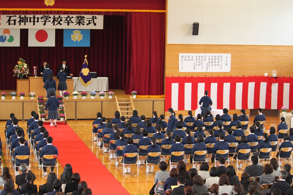 本日4校時、体育館において、石神中学校同窓会会長 志賀吉延 様をはじめ役員の皆様にお越しいただき同窓会入会式を行いました。石神中学校同窓会の会員は今年度の卒業生103名を加えると11435人になります。新たに入会する卒業生の皆さんは石神中学校同窓会の会員としての誇りと自信を持って世界に大きく羽ばたいてほしいと思います。