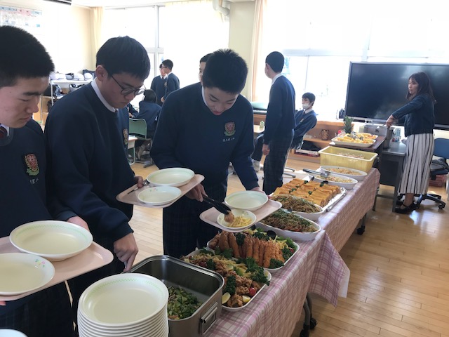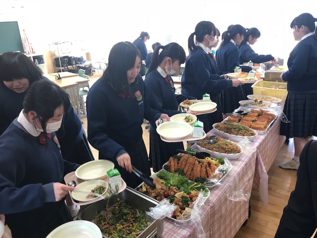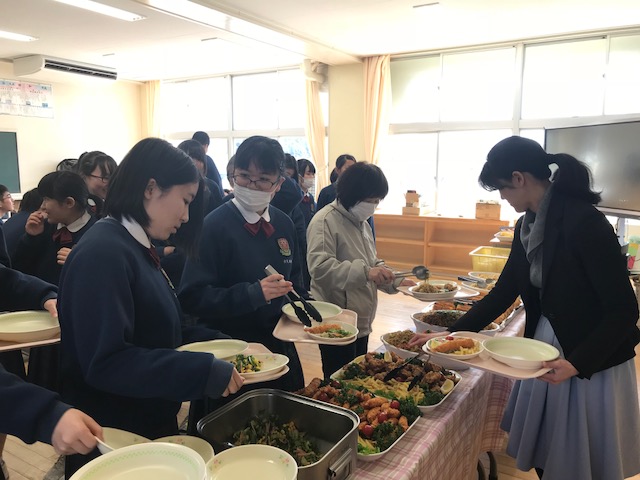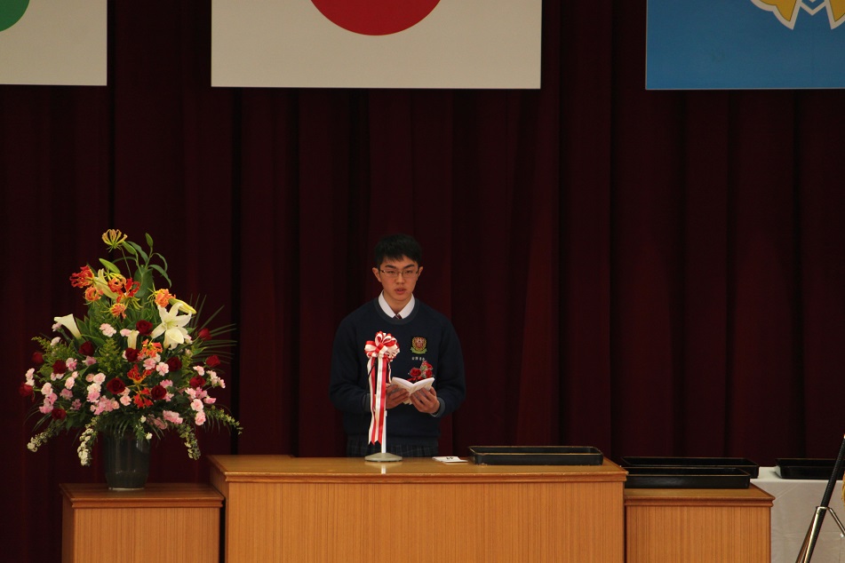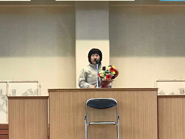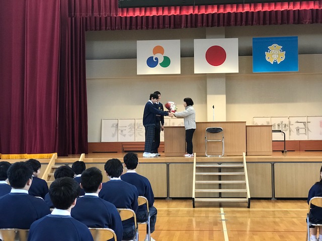 同窓会入会式終了後、3学年では今年度末に定年退職される小幡仁子先生とのお別れの集いを行いました。3学年を代表して木幡祥太君が感謝の言葉とともに花束贈呈を行いました。生徒達は小幡先生より「中学校卒業後は自分の責任で行動し、勉強し、自分の人生をしっかりと生きて欲しい。」と励ましの言葉をいただきました。