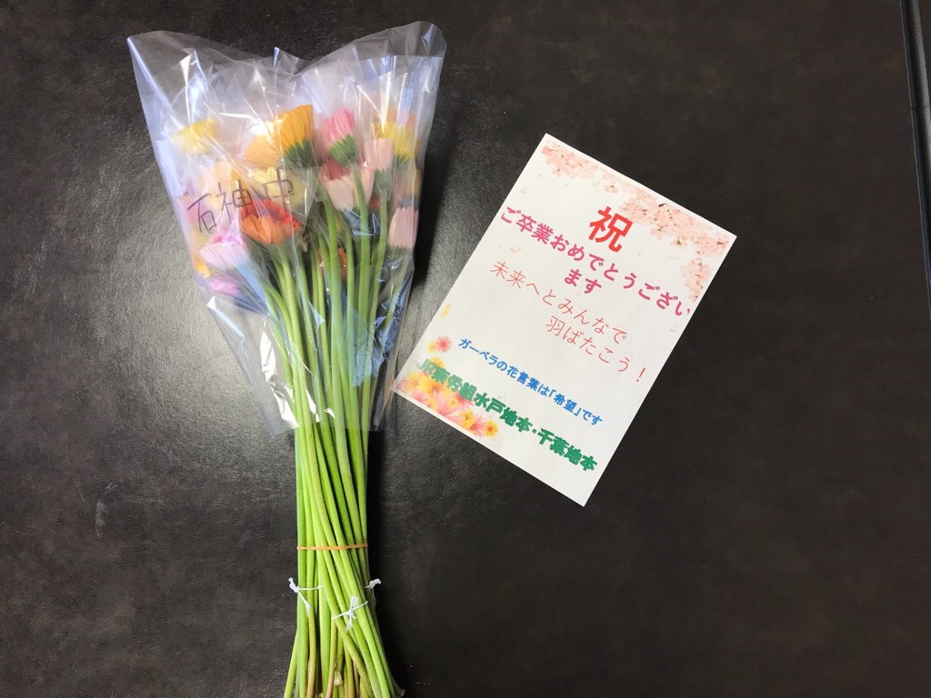 東日本旅客鉄道労働組合様(JR東労組様)より、ガーベラをいただきました。地震、津波、原発事故で被災した南相馬の子ども達が明るく元気に巣立ってほしいとの気持ちからJR東労組の皆様によって、震災翌年からすすめられている「南相馬市立小中学校卒業生に希望の花を贈る取組み」によるものです。ガーベラの花言葉は「希望」です。卒業生が希望を胸に石神中学校を巣立つことが出来るよう、いただいたガーベラは明日、卒業生におくらせていただきます。
