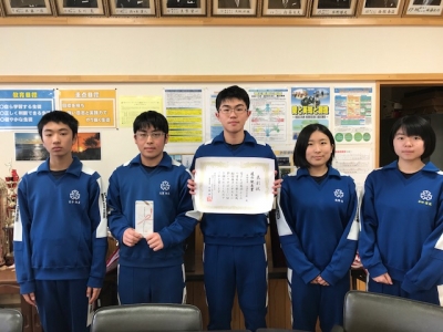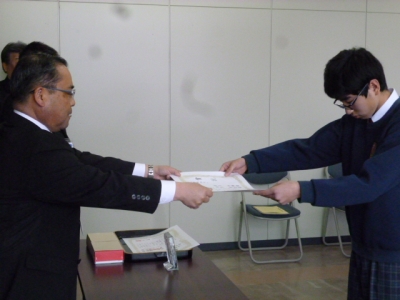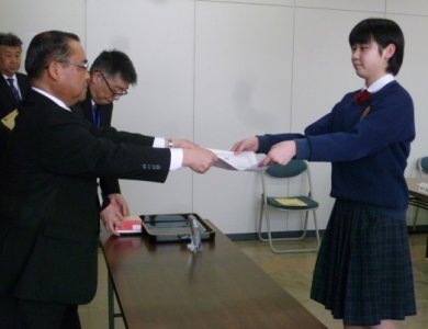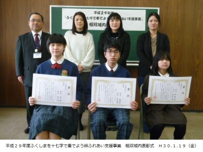 「ふくしまを17字で奏でよう 絆ふれあい支援事業」の「復興部門」で作品が佳作に選ばれた相良和輝君(2年)とお母様、柏原凪沙さん(3年)とお母様の表彰式が、1月19日(金)に、南相馬合同庁舎において行われました。