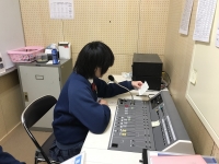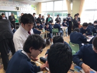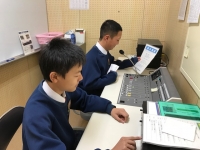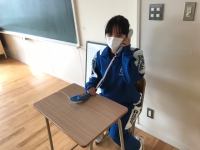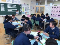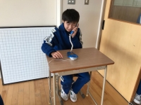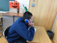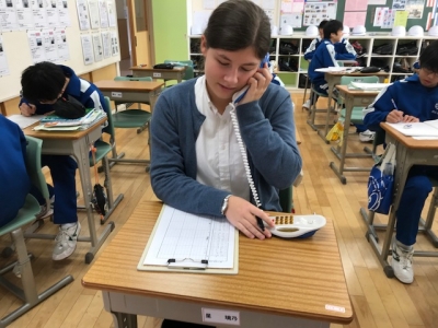今日の1校時の1年生の英語の授業では、電話の対話についてパフォーマンステストを実施しました。二つの教室を電話で結び、シェリー先生に電話をかけ、自分の誕生日パーティーに誘うという場面設定で