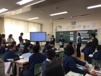 という場面設定の下で、生徒達はシェリー先生を遊びや買い物に誘うために表現に工夫をこらして対話に取り組みました。