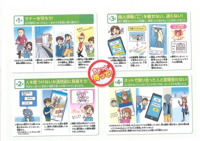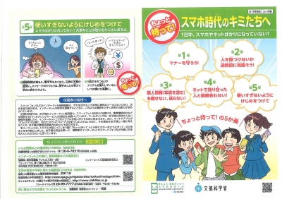 ちょっと待って!スマホ時代のキミたちへ1.pdf また、登下校時の自転車運転について、大きな事故につながりかねない事案を見聞きしていることから、放送による指導とともに、次のプリントを配付し、各学級でも指導しました。ご家庭でも、ご指導を宜しくお願いします。