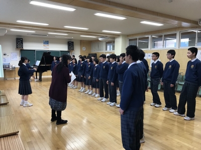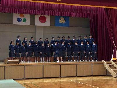 選曲の理由は、第一候補は「You Can Fly」だったけれど、他のクラスとかぶってしまい、平和に決めたいと思い、第二候補の「With Your Smile」にしました。合唱を通して伝えたいことは、2-1の団結力です。今の学級の様子は、みんな大きな声で音程をしっかりとって歌えていると思います。目標は、悔いの残らないような合唱にすることです。