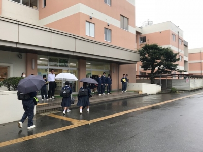 今日は雨の寒い朝ですが、生徒会役員、代表委員、生活委員は元気にあいさつ運動を実施中です。