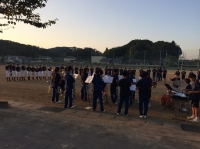 新人大会に出場する各部活動の選手に向けて、吹奏楽部が応援演奏を行いました。9月15日には体育館で練習する男女バレーボール部、男女バスケットボール部、男女卓球部、男女剣道部の選手に向けて、そして今日は校庭で練習する野球部、サッカー部、男女ソフトテニス部の選手に向けて、嵐のGUTSと校歌を演奏しました。