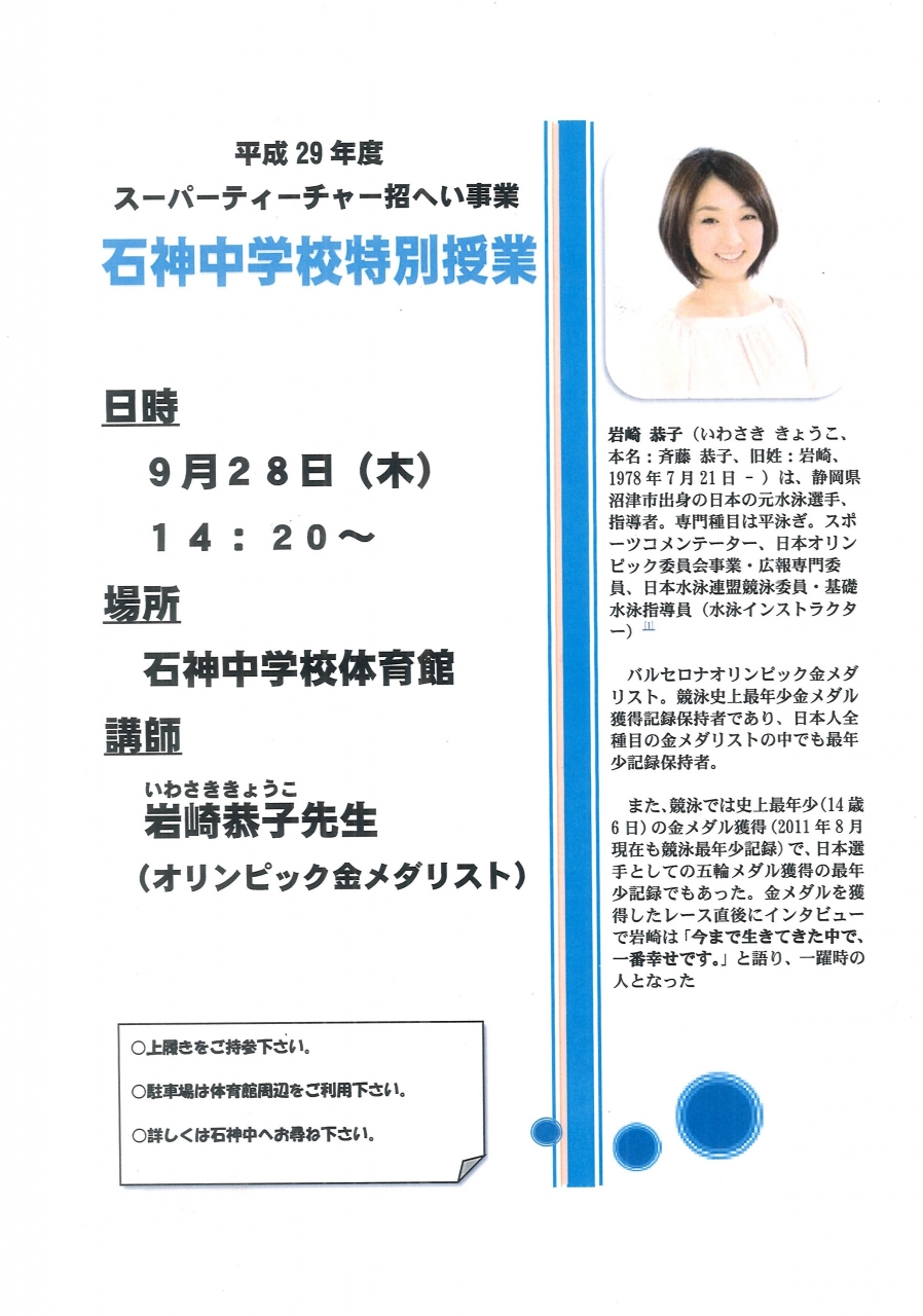明日9月28日(木)、14時20分より、本校体育館において、バルセロナオリンピック金メダリストの岩崎恭子先生による特別授業を行います。