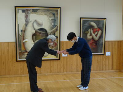 中島敏明さんより、寄贈される作品の目録を生徒会長の渡部朔矢さんに贈呈されました。