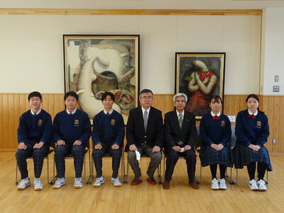記念写真撮影:中央に、中島敏明さん(中央右)、志賀吉延同窓会長(中央)、生徒会執行部代表(3年生)