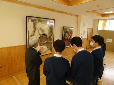 2022年3月10日 12時37分本日、同窓会入会後、本校同窓生である中島敏明さんより、絵画作品3点(1点は後日)の寄贈を受け、贈呈式を行いました。中島敏明さんは、南相馬市原町区高倉で生まれ、1963年(昭和38年)に本校を卒業されました。中島さんは現在、千葉県に住居を構え、画家として、多くの作品を制作し、二科展を始め、国内外の展覧会で様々な入賞の受賞歴があります。個展も数多く開催され、内閣総理大臣賞や千葉県教育功労者なども受賞されています。長年にわたり二科会理事や千葉県美術会常任理事、日本美術家連盟会員なども務めています。このたび、同窓会長であり、中島さんの同級生でもある志賀吉延さんのご紹介により、母校である石神中学校に絵画作品の寄贈が実現されることとなりました。作品は、本校2階多目的教室に展示されます。