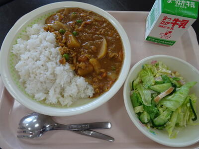 <今日の給食:ポークカレー、イタリアンサラダ、牛乳>