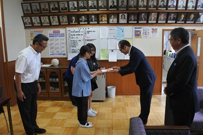 寄贈式では相双分区ガバナー補佐岡田様から、部を代表して部長の古川さん、副部長の渡部さんに目録が手渡されると、児童たちからは感謝の言葉が述べられました。新しい楽器を大切に使わせていただき、ご恩返しとして全国大会で演奏できる日を楽しみにしています。
