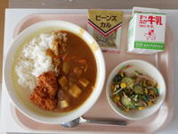 3月3日(火)の給食献立は、「ごはん、カツカレー、ポパイサラダ、ビーンズカル、牛乳」でした。