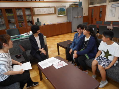 コンクール終了後、学校に戻ってくると校長先生や引率した先生方にあいさつとお礼を伝えます。先生方からはねぎらいの言葉が贈られました。