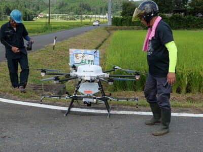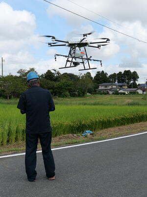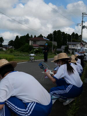 米っ子上真野(学校田の名称)に着くと、5年生の目の前にあったのはドローンです。空からの映像を撮るのに使うことは知っていましたが、農薬散布まで行えるとは驚きでした。なお、見学者の安全を考慮して今回は農薬の代わりに水を散布しました。令和になって農業もますます進化しています。