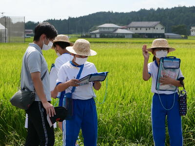 2022年9月12日 10時24分中秋の名月も過ぎると田んぼの稲は少しづつですが黄金色に変化し始めます。稲は収穫の瞬間まで様々な自然災害や害虫、病気などから守っていかなくてはなりません。今回は地域学校協働本部の皆様にお世話になりながら、稲の大敵であるカメムシを退治する方法を教えていただきました。