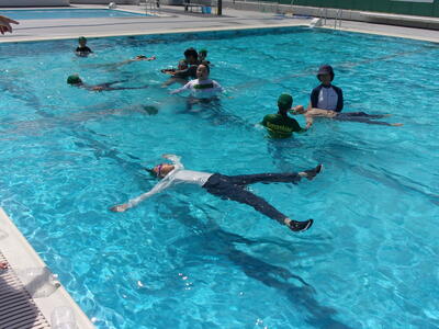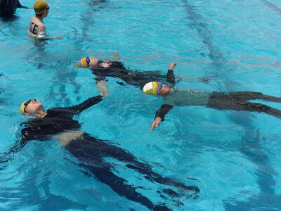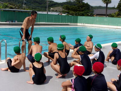 2023年7月18日 12時47分今日は、日本赤十字社福島県支部から講師の先生に来ていただき、全学年で着衣泳をしました。何も持たないで浮く方法、ペットボトルを持って浮く方法について学びました。また、反対にどのようにしたら沈んでしまうのかということを教えていただきました。