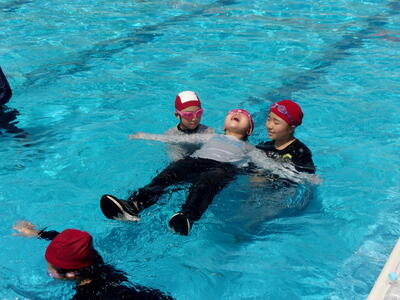 今日は、日本赤十字社福島県支部から講師の先生に来ていただき、全学年で着衣泳をしました。何も持たないで浮く方法、ペットボトルを持って浮く方法について学びました。また、反対にどのようにしたら沈んでしまうのかということを教えていただきました。