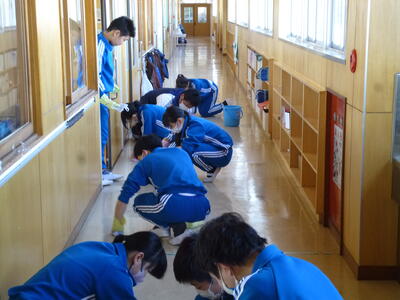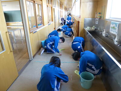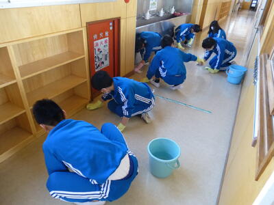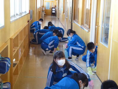 来週卒業を迎える6年生が、これまでお世話になった校舎に感謝の気持ちを込めて、特別に清掃活動を行いました。6年生が話し合って、日頃の縦割班清掃だけではできなかった廊下の汚れを中心に、一生懸命取り組んでくれました。6年生のがんばりに下級生も感動していました。おかげで廊下は見違えるようにきれいになりました。6年生の皆さん、ありがとうございました。