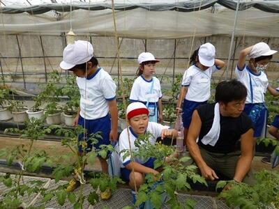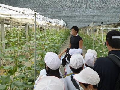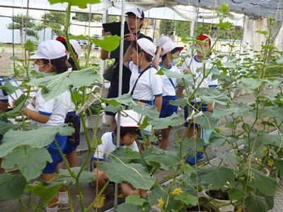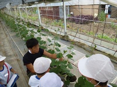 3年生は、総合的な学習の時間に「上真野たんけん隊」として地域の産業や働く人々について調べています。今回は、カヤノキファームさんを訪問し、野菜作りについて見学したり質問したりしました。カヤノキファームさんからは、ゴーヤやキュウリを栽培するときの工夫や努力について教えていただきました。今回も上真野地区のよさを知ることができました。